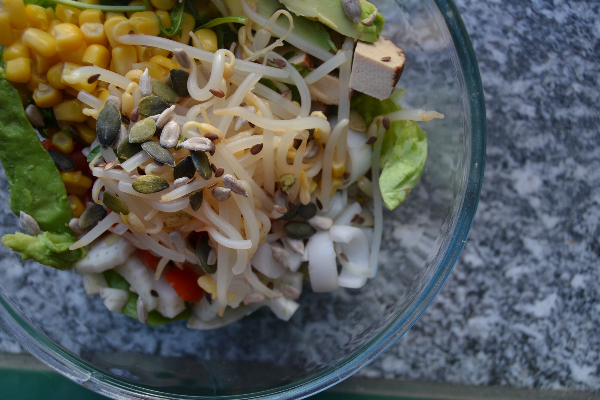 Ma credo che non serva la preparazione per questa insalata…comunque ho messo prima tutta la parte verde (insalata e rucola), pulito e tagliato grossolanamente le verdure, aggiunto tutto, guarnito con semi misti (zucca, lino e girasole), condito con olio evo, sale e spruzzatina di limone.