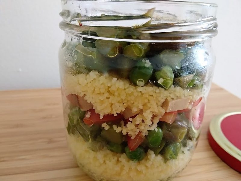 A questo punto, nel vostro vasetto, versateci prima dell’olio, poi il couscous, uno strato di verdura, dei pomodori a tocchetti e il tofu (tagliato a dadini). Ultimate la superficie con altra verdura e le punte di asparagi.