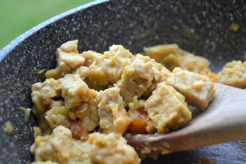 Ho fatto stufare la cipolla con il porro e la carota tagliata grossolanamente per circa 20 minuti, finchè non saranno teneri (ne ho tolto una parte per frullarli a crema). Ho aggiunto il tempeh tagliato a dadino, coperto con un pochino di latte vegetale e fatto cuocere per altri 10-15 minuti. Aggiunto la cremina frullata con latte vegetale e due noci.