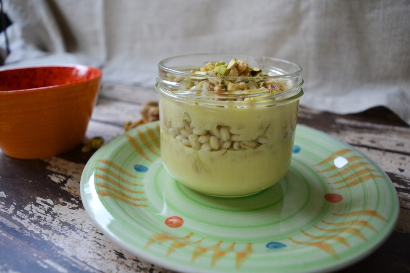Una volta cotto l’orzo, potete fare come ho fatto io e metterlo in un vasetto, alternando orzo a vellutata. In cima decorate con la frutta secca e terminate con l’olio aromatizzato.
