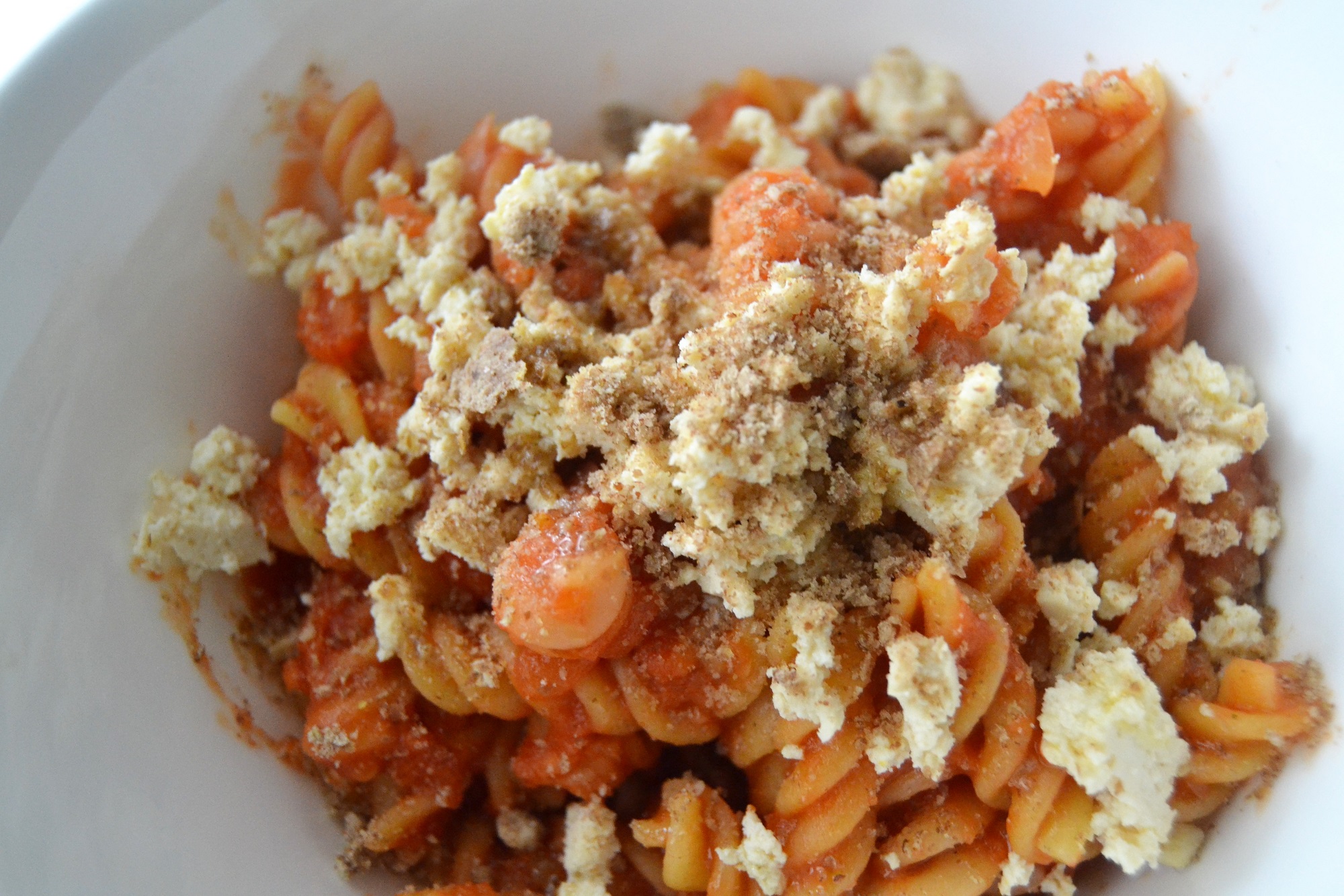 Ho aggiunto come parte proteica al pasto 100 g di tofu lasciato marinare per almeno due ore in salsa di soia (allungato di acqua, e aromi, rosmarino, salvia e prezzemolo), sminuzzato con le mani, decorato infine con una grattata di semi di lino e anacardi frullati al momento.