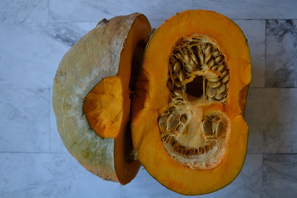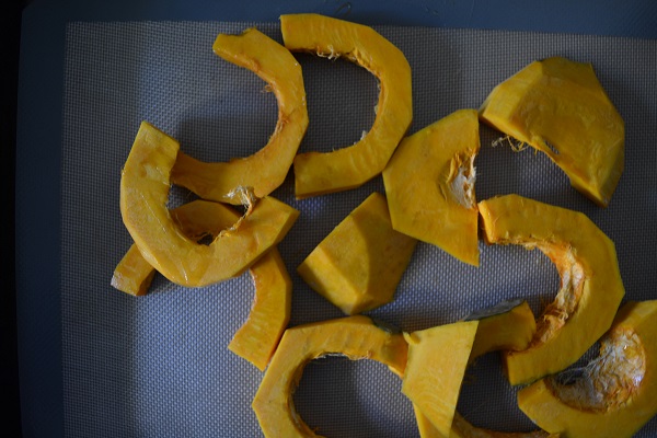 Pulite bene la vostra zucca (ne basterà anche metà se è una zucca molto grande), tagliatela a fettine per il lungo, irrorate d’olio e fate cuocere in forno ventilato per circa 25′ a 180° e finchè non sarà cotta completamente.